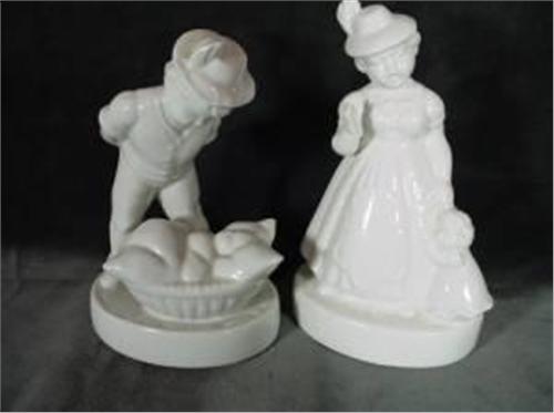 PAIR OF PORCELAIN FIGURINES, A BOY AND A GIRL IN A BONE COLORED PORCELAIN. MARKED ON BOTTOM. 6"X3.5".