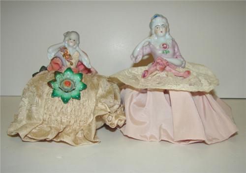 PAIR OF PORCELAIN HALF DOLL FEMALE PIN CUSHIONS. 4.25” H & 5.5” H