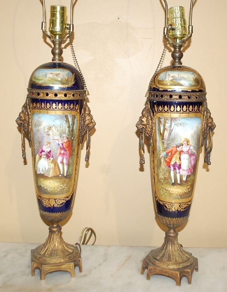 CHANGED TO TABLE LAMPS, YEARS AGO, PORTRAIT AND SCENIC DECORATION, LION RING PULLS, GILT DECORATION ON METAL, 7" DIAMETER, 17"TALL, PLUS LAMP HARPS.