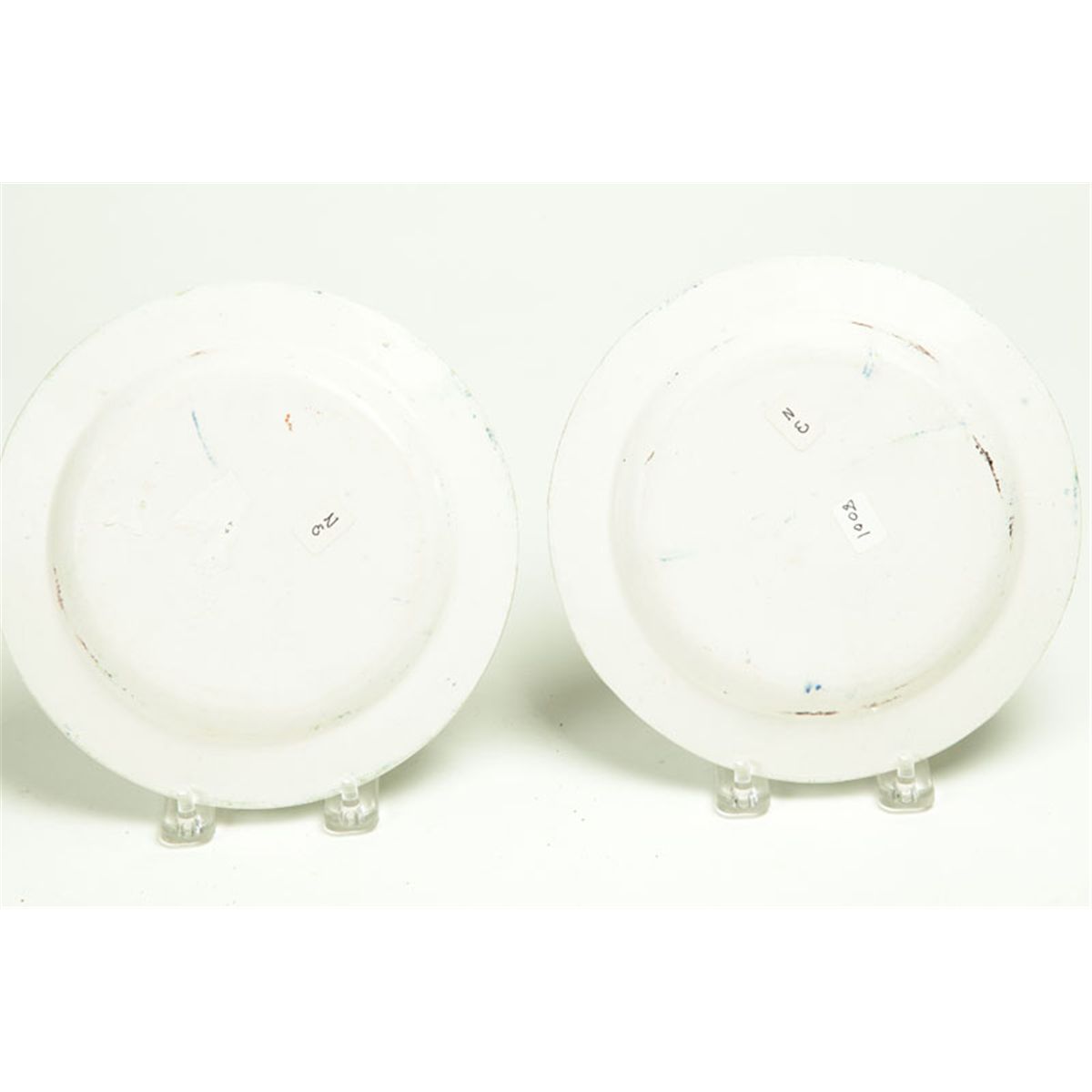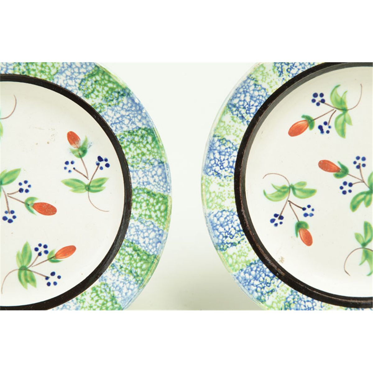 England, 1815-1830. Blue and green spatter rims with floral sprig centers. One rim with flake. 7 1/2"d.