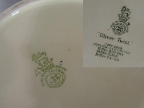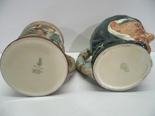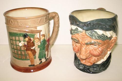 PAIR OF RELIEF DECORATED ROYAL DOULTON MUGS. Both are marked on bottom. Consists of one toby mug of an elderly female. Marked at back near bottom of handle "Granny". Has one chip at bottom near rim. 6" H. The other mug is decorated with a town scene scene with townspeople. Titled at bottom "Oliver Twist". 6" H
