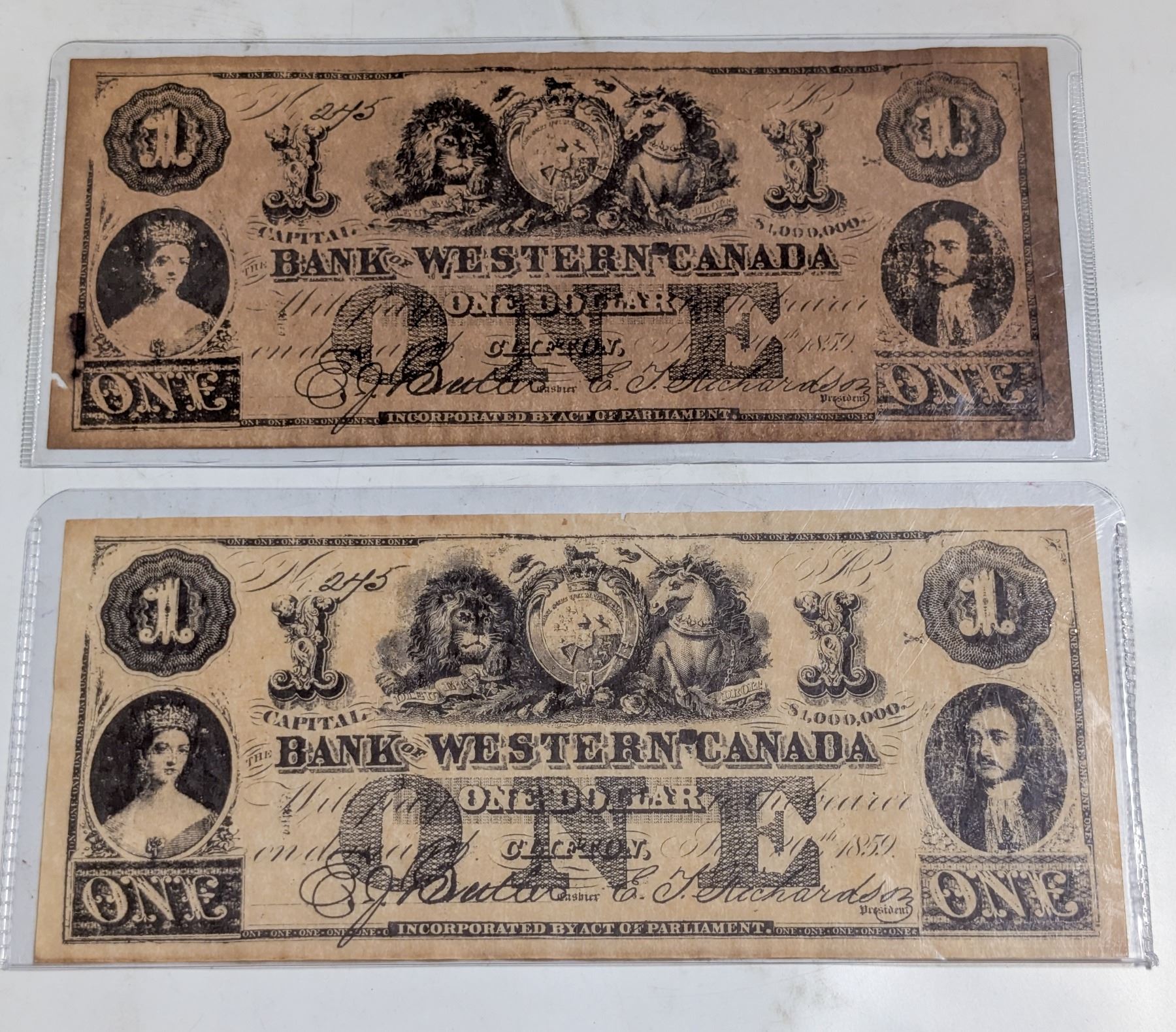 PAIR OF REPLICA BANK OF WESTERN CANADA BANKNOTES
