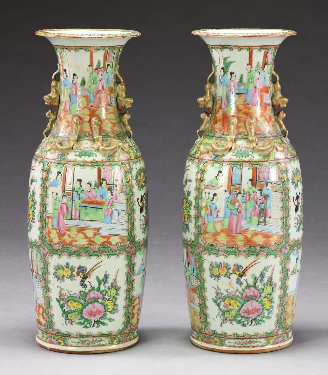 Each with inverted lip and Foo Dog handles, two rows of panels floral decorated alternating with domestic scenes; all within foliate borders. SIZE: 24 1/2" h. CONDITION: generally good. (05-759/TG). $400-800.