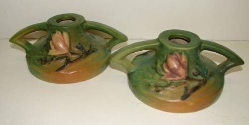 PAIR OF ROSEVILLE MAGNOLIA, 1943 CANDLESTICKS. Both have double handles. Marked on bottom “Roseville/U.S.A./1156-2 1/2”. 2.25” H