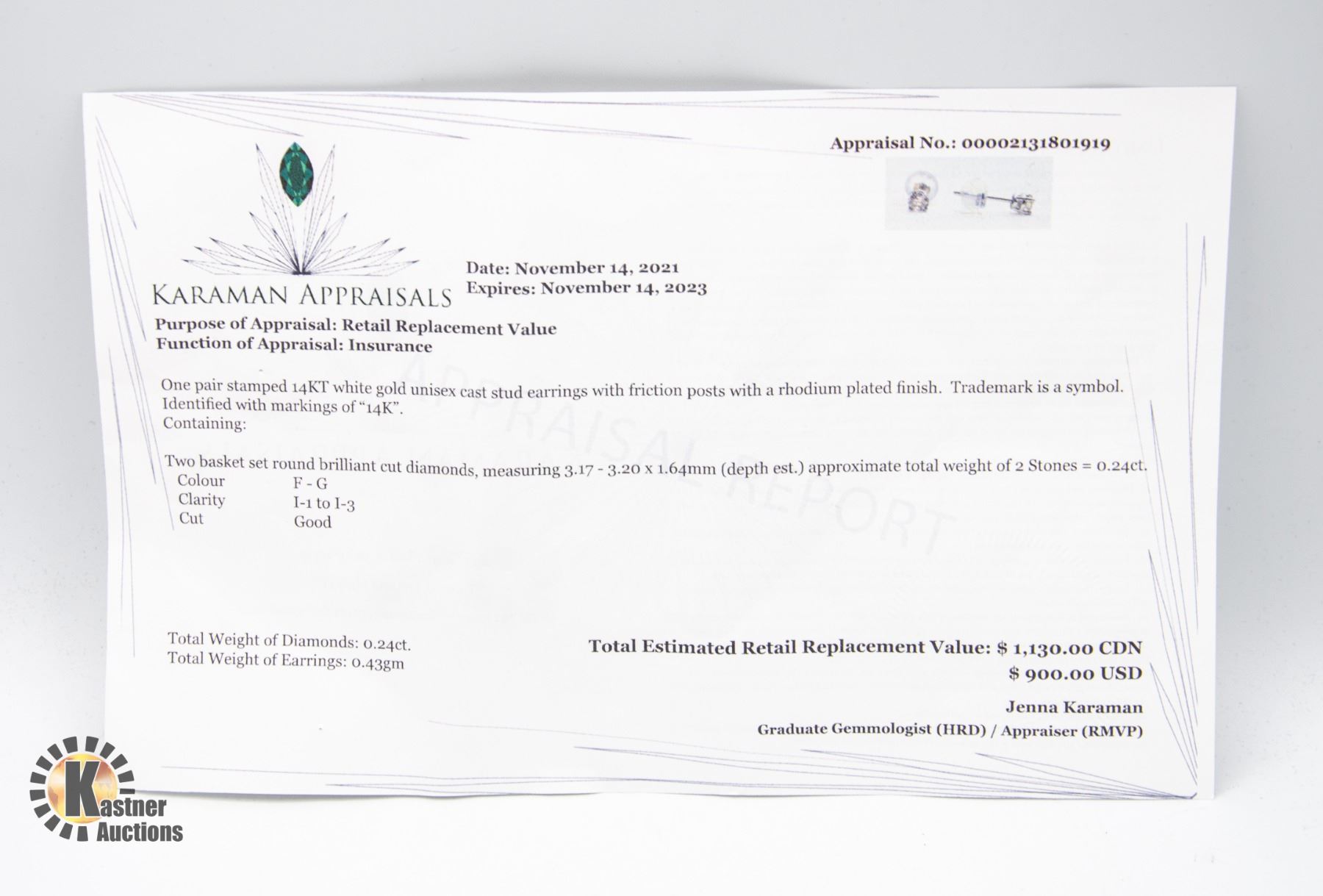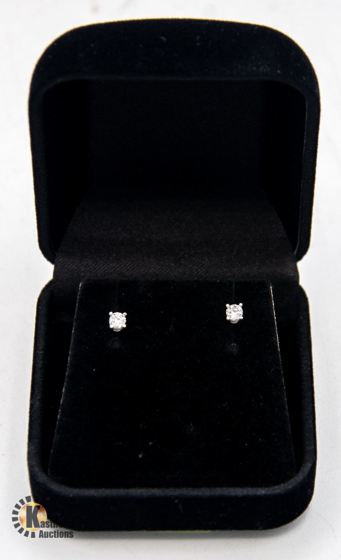A TOTAL 0.24 CARATS SET IN 14 KARAT WHITE GOLD EARRINGS I-1TO I-3 AND COLOR OF F-G APPRAISED VALUE $1,130.00 **ALL ITEMS MUST BE REMOVED BY 5PM SATURDAY, OCTOBER 21ST 2023. ALL REMAINING ITEMS WILL BE SUBJECT TO A $6.00 PER DAY STORAGE CHARGE. ANY ITEMS REMAINING AFTER MONDAY, NOVEMBER 6TH, 2023 WILL BE CONSIDERED FORFEITED. NO REFUNDS WILL BE ISSUED FOR FORFEITED ITEMS. TO SCHEDULE A PICK UP APPOINTMENT CLICK HERE