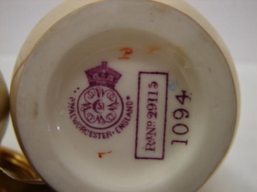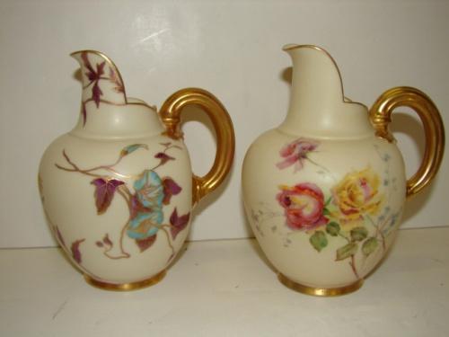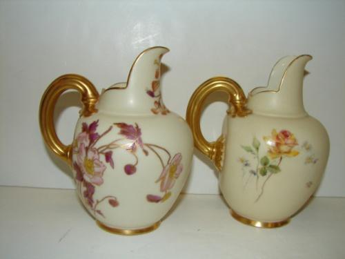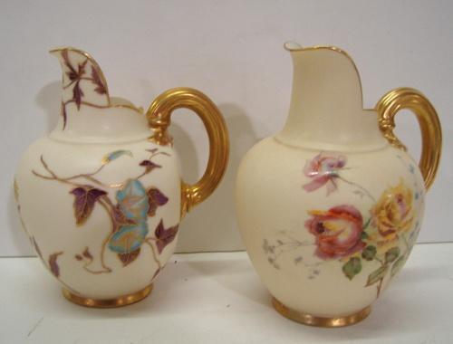 PAIR OF ROYAL WORCESTER CREAMERS. Circa 1885. Floral and gilt decorated. Both are marked on bottom with English Registry Number. Also marked on bottom “1094”. 5” H