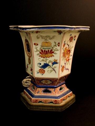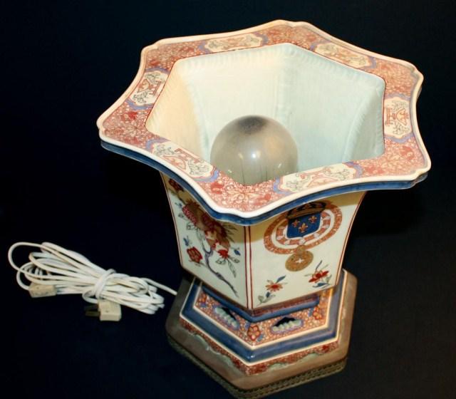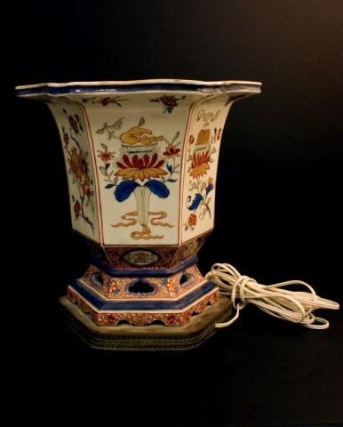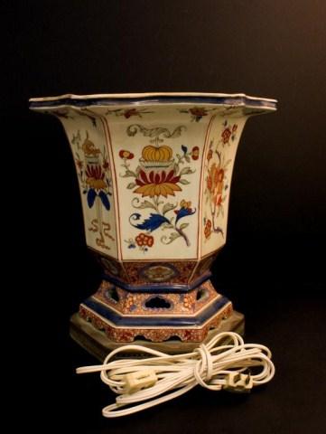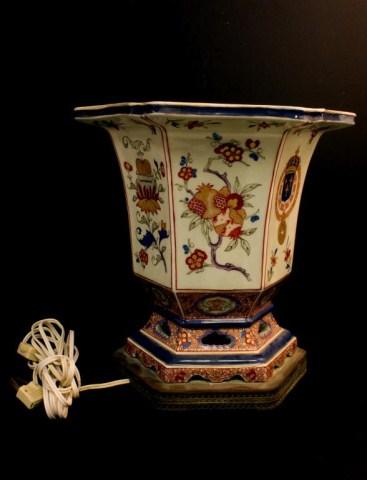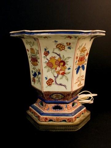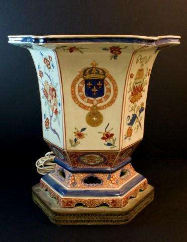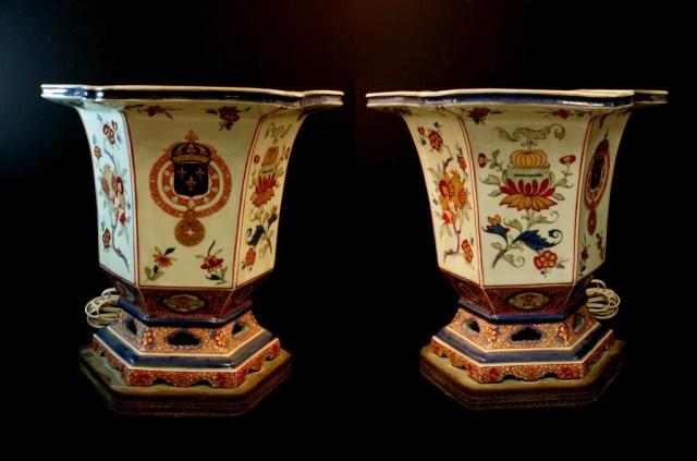 Has an oriental floral design. Mounted on bronze bases. Measures 11 3/4" h X 12" dia.