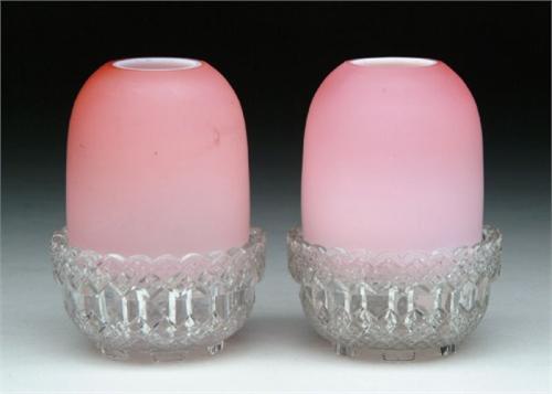 PAIR OF SATIN GLASS FAIRY LAMPS. Pair of fairy lamps feature satin glass shading from pink to white with a white lining and matte finish. Pressed glass holders are signed "S. Clarke Trademark Fairy Pyramid". SIZE: 4 in. t. CONDITION: Very good to excellent. 5-60270