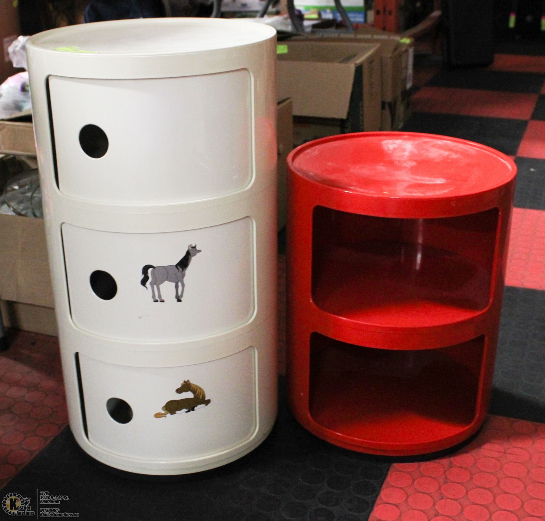 PAIR OF SHELVING UNITS - ONE WHITE + ONE RED