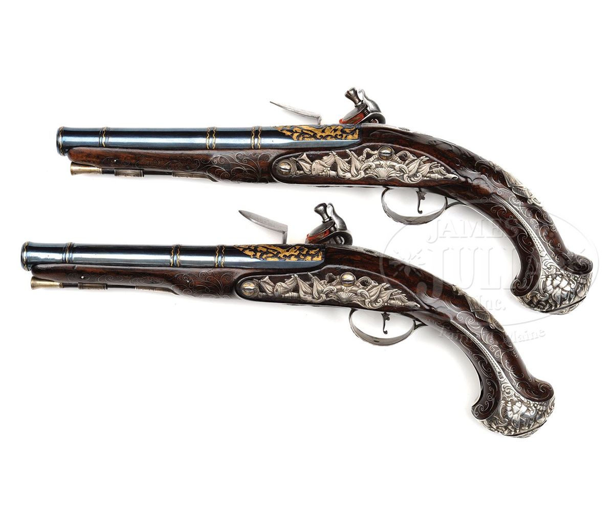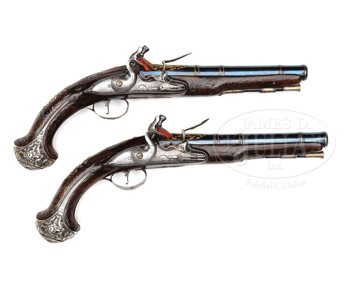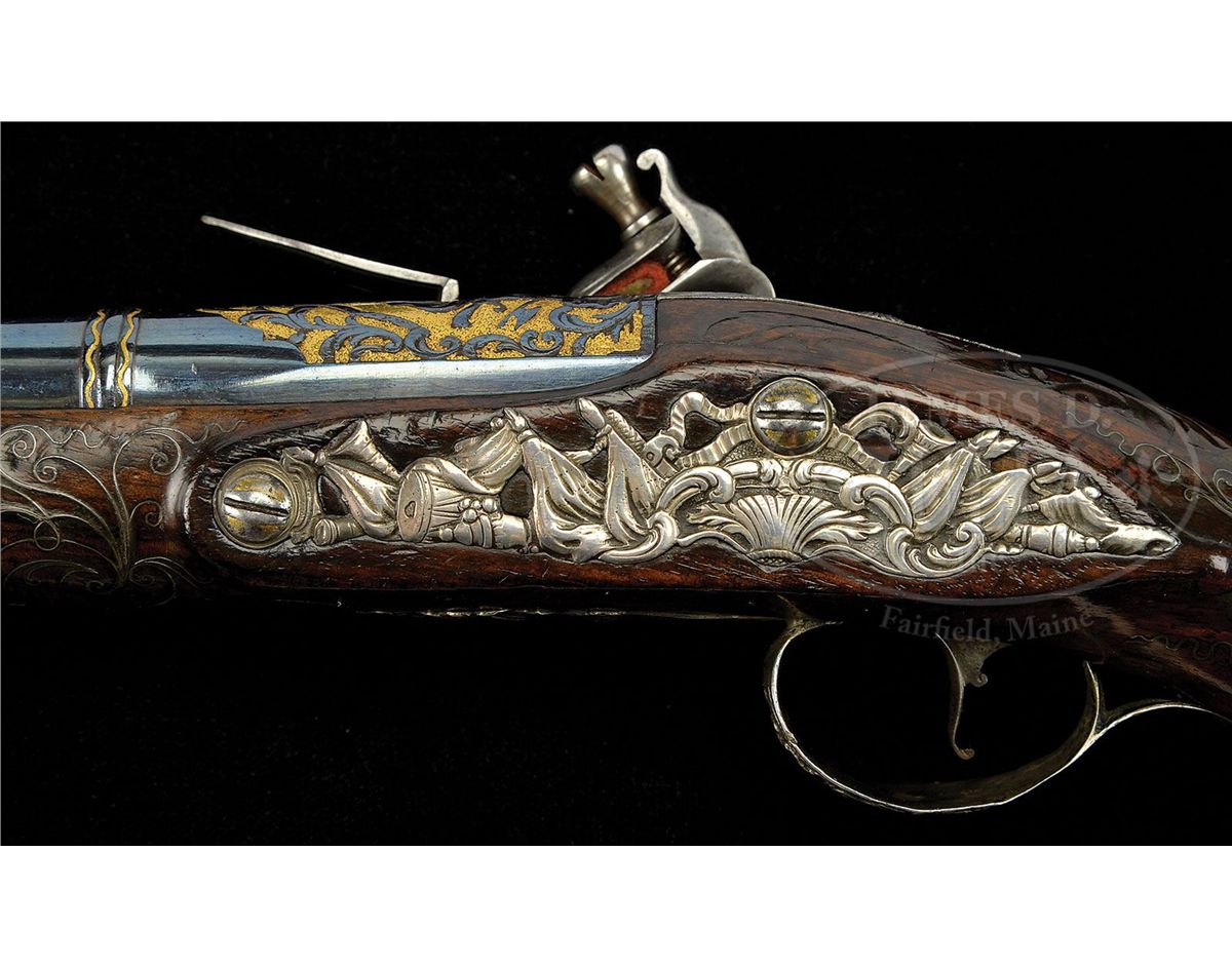 NSN. These extremely attractive pistols have high relief cast and chased silver mounts with French discharge marks. The heavy silver sideplate with panoplies of arms. Butts cast and chased with trophies of arms. Trigger guards cast and chased with florals and urns. Locks are relatively plain. Bbls have four rings beginning at muzzle enhanced with gold. Breech chiseled with panoply of arms against a gilt ground. Bbls are high polished blue, bluing later. Walnut full stocks are profusely inlaid with silver wire. Some pieces are silver with drums, cannons and arms. Stock has shell carving behind tang. Form of these pistols is very much English. Mounts are French, the likelihood being that they were ordered by a French officer or that the mounts were applied in France. Ramrods are silver tipped and appear to be original to pistols. NOTES: All together a most attractive pair of Revolutionary or period officer's pistols. PROVENANCE: See Early Firearms of Great Britain and Ireland from the Collection of Clay Bedford, 1971, p. 43, #32; see Catalog, 1995, by Finer, #101. Collection of Dr. Douglas Sirkin. CONDITION: Locks are gray, but overall crisp. Gilding in pans is probably later as well as gilding on breeches is refreshed. Bbl blue later but 100% intact. Actions are crisp. Stocks are excellent with one small chip repaired forward of lock on one pistol. Profuse silver wire has virtually no losses. Mounts are crisp, only slightly rubbed and generally rate excellent. 4-49897 MZ47