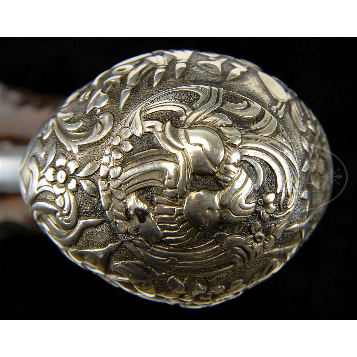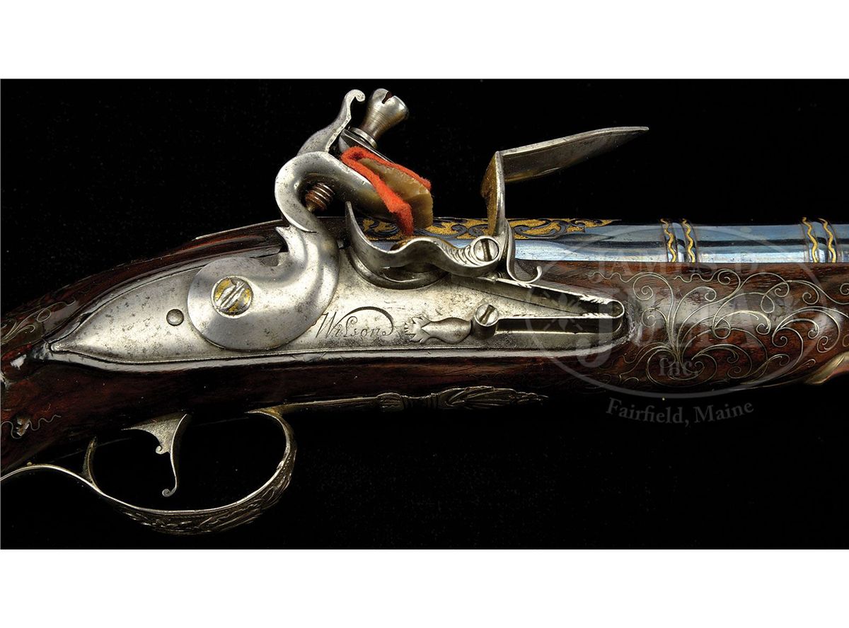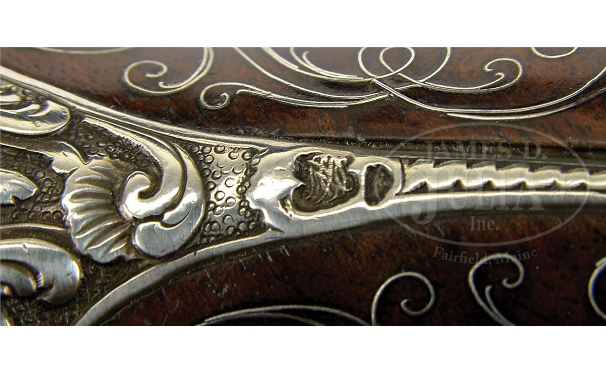 NSN. These extremely attractive pistols have high relief cast and chased silver mounts with French discharge marks. The heavy silver sideplate with panoplies of arms. Butts cast and chased with trophies of arms. Trigger guards cast and chased with florals and urns. Locks are relatively plain. Bbls have four rings beginning at muzzle enhanced with gold. Breech chiseled with panoply of arms against a gilt ground. Bbls are high polished blue, bluing later. Walnut full stocks are profusely inlaid with silver wire. Some pieces are silver with drums, cannons and arms. Stock has shell carving behind tang. Form of these pistols is very much English. Mounts are French, the likelihood being that they were ordered by a French officer or that the mounts were applied in France. Ramrods are silver tipped and appear to be original to pistols. NOTES: All together a most attractive pair of Revolutionary or period officer's pistols. PROVENANCE: See Early Firearms of Great Britain and Ireland from the Collection of Clay Bedford, 1971, p. 43, #32; see Catalog, 1995, by Finer, #101. Collection of Dr. Douglas Sirkin. CONDITION: Locks are gray, but overall crisp. Gilding in pans is probably later as well as gilding on breeches is refreshed. Bbl blue later but 100% intact. Actions are crisp. Stocks are excellent with one small chip repaired forward of lock on one pistol. Profuse silver wire has virtually no losses. Mounts are crisp, only slightly rubbed and generally rate excellent. 4-49897 MZ47
