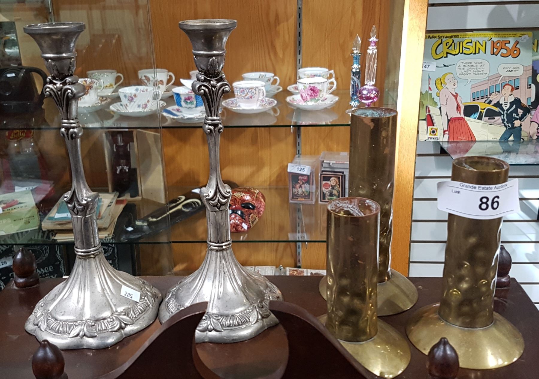 PAIR OF SILVER PLATE CANDLESTICKS AND 3 PCS OF TRENCH ART