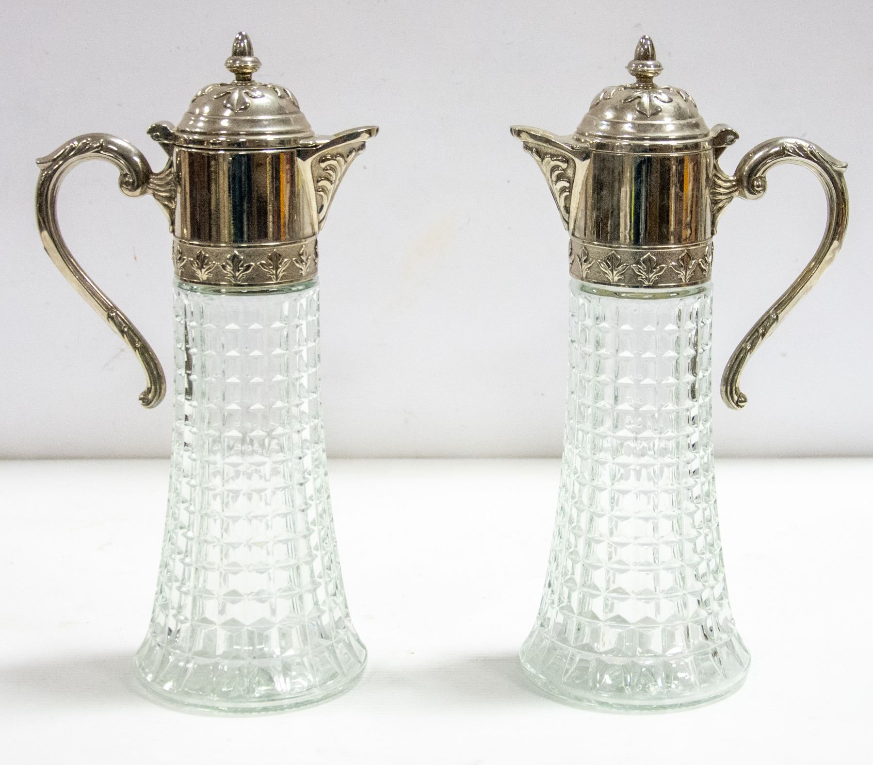 PAIR OF SILVER PLATED GLASS PITCHURES