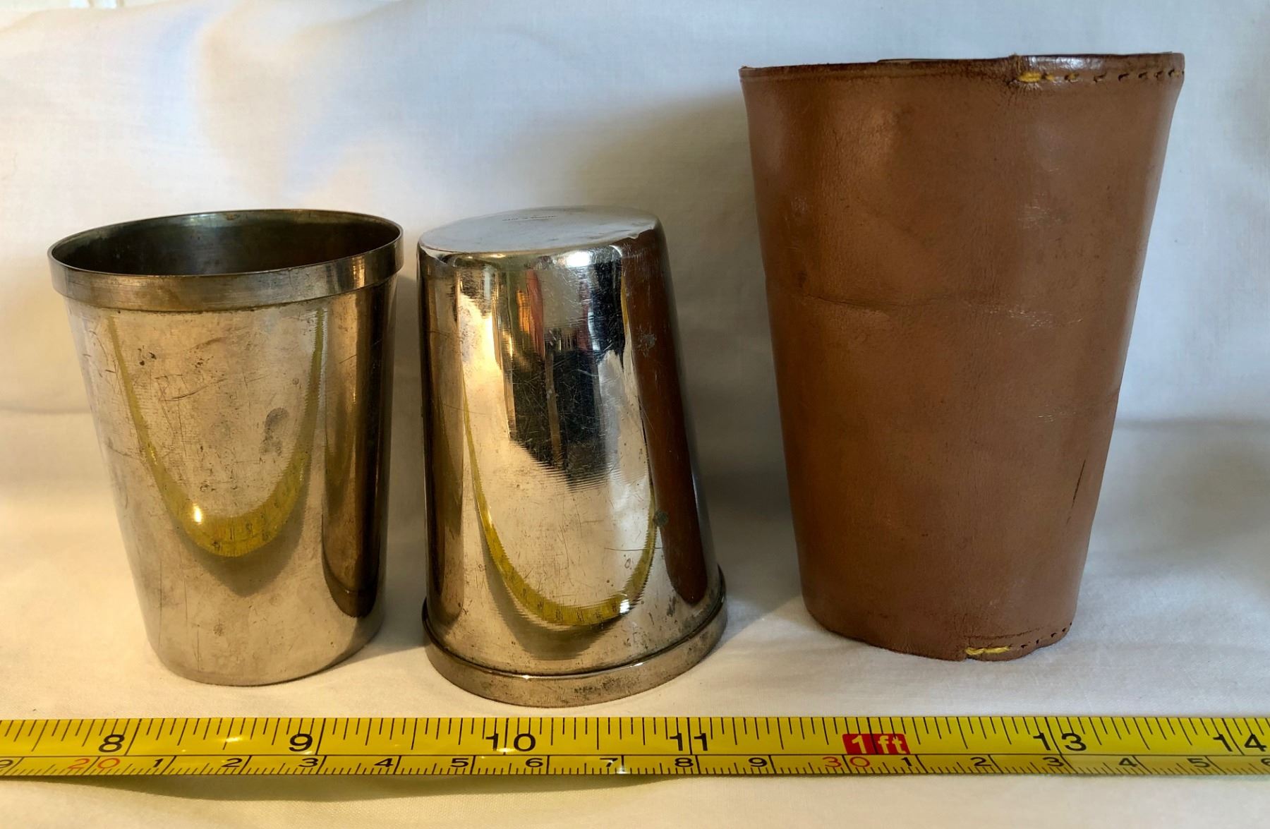 PAIR OF SILVER (?) TUMBLERS WITH LEATHER CARRYING CASE - GERMANY
