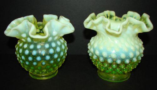 PAIR OF SMALL OPALESCENT VASELINE GLASS VASES. Hobnailed pattern. Fluted tops. One vase has moulded Fenton mark on bottom. The other vase is unmarked. Vases differ slightly in color & shape. 4.5” H