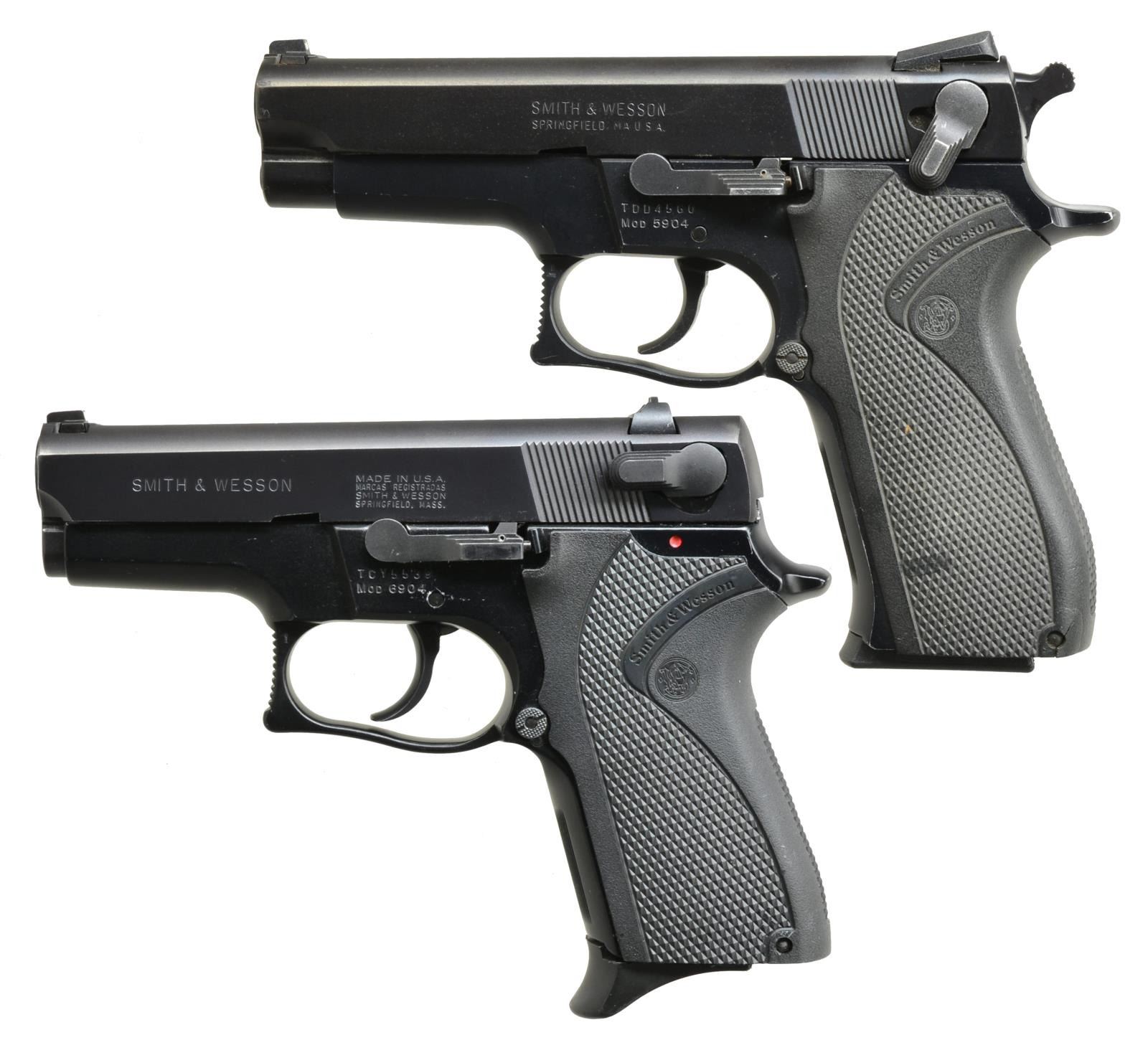 1) SMITH & WESSON 5904 PISTOL. Cal. 9mm. S# TDD4560. Bbl. 4". Dovetail white bead front sight & dovetail no-back 2 dot rear sight. 1 Piece S& W hard rubber grips. MAGS: 1 - 14 rd. factory mags. & 1 Megar 15 rd. mag. CONDITION: retains most of its original finish w/ slight thinning on sharp edges. Grips are very good w/ good checkering. Bore is good. (20-3642/BT). 2) SMITH & WESSON 6904 PISTOL. Cal. 9mm. S# TCY5539. Bbl. 3 1/2". Dovetail white bead front sight & dovetail 2 bead fixed rear sight. Checkered S& W black hard rubber grips. MAGS: 4 total - 2 Factory 12 rd & 2 Mec-Gar 15 rd. CONDITION: gun retains most of its original finish w/ minor wear on sharp edges. Grips are in excellent condition. Bore is good. (20-3649/BT). BOTH MODERN. $600-900.