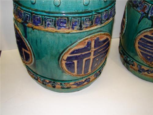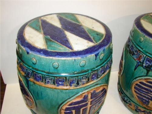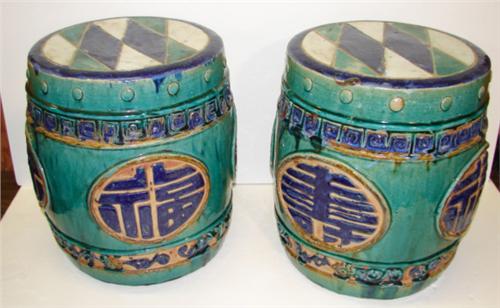 PAIR OF SOUTHEAST ASIAN GARDEN SEATS. Cobalt blue, white, and green glaze. 15” H, 12” Dia.