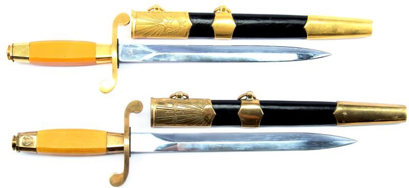 13.5 inches total length, ricassos inscribed with Cyrillic ‘zu’ within a triangle and 'HOO766' and 'NB5718K'. Both daggers and scabbards are in very good condition. This lot has a reserve.