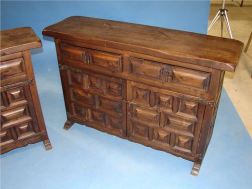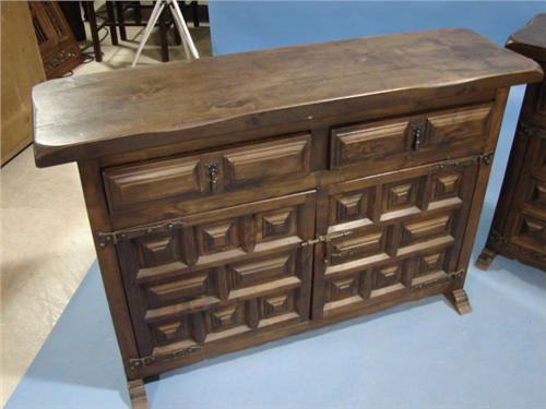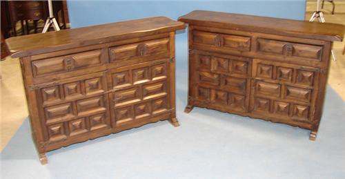 PAIR OF SPANISH STYLE CONSOLE CABINETS. Both have shoe feet, dovetailed drawers, pinned construction, and wrought-iron hardware. 31”H, 47.25”L, 13.5”D
