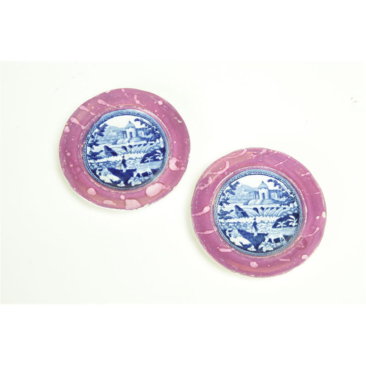 England, 1st half-19th century. Dark blue transfer-printed pastoral designs with pink luster rims. Rim flake to one. 4"d.