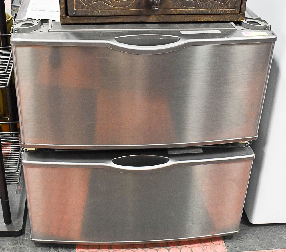 FOR YOUR WASHER AND DRYER, HAS A MATTE METAL FINISH ON THE SIDES & COMES WITH INSTALLATION INSTRUCTIONS