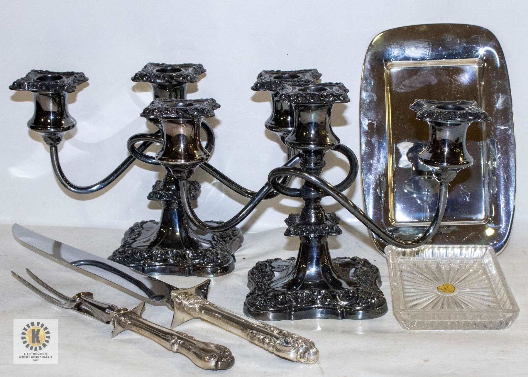 2 THICK CANDLEABRAS HALLMARKED + CRYSTAL INSERT SILVER PLATED TRAY ETC ALL TOGETHER (STERLING SILVER HAS BEEN TESTED)
