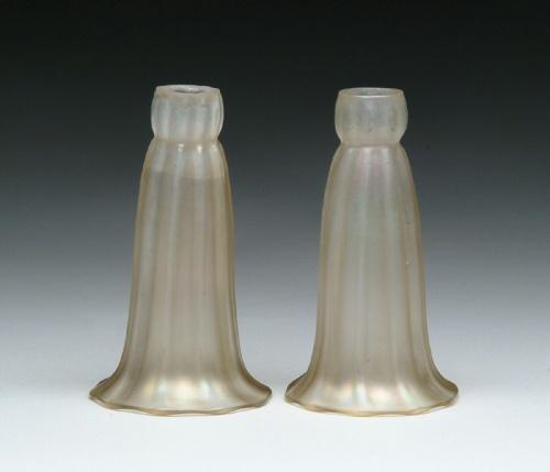 PAIR OF STEUBEN LILY SHADES. Beautiful pair of Steuben Verre de Soi lilies have ribbed body and nice iridescence. One shade is signed with silver Fleur de Lis at the fitter. SIZE: 5 in. t. CONDITION: One shade has hairline at fitter and slightly into body, otherwise very good to excellent. 5-61470