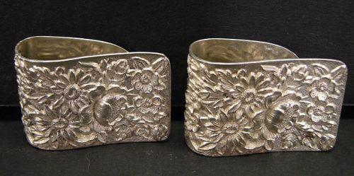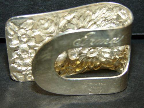 PAIR OF STIEFF ROSE NAPKIN CLIPS. Marked on reverse “S. Kirk & Son/Sterling/17”. One is monogrammed on reverse “Dan” & the other “Irma”.