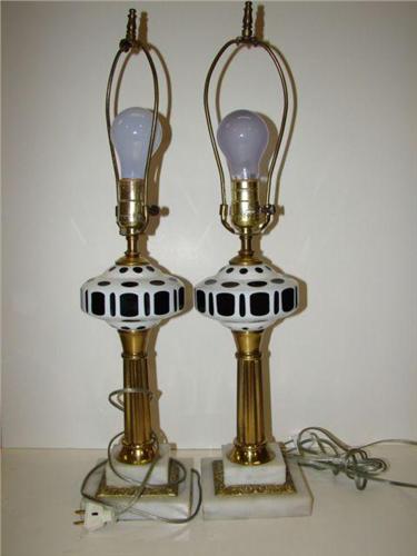 PAIR OF TABLE LAMPS. Marble & ormalue bronze bases with gilt metal stems and white cut-to-blue cased glass bowls. Electrified. 23.25” H