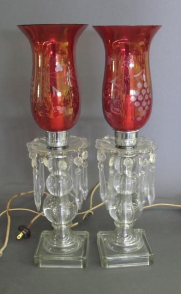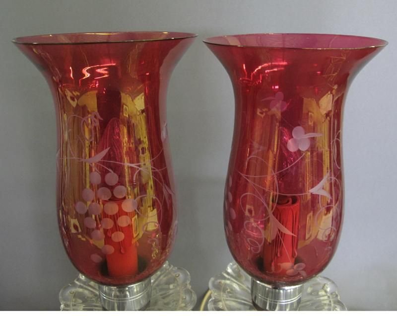 -with cranberry etched glass hurricane shades and hanging prisms.