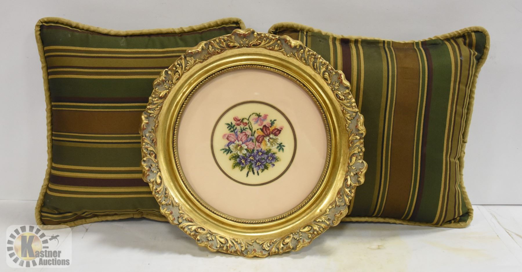 PAIR OF THROW PILLOWS SOLD WITH FRAMED PETIT POINT