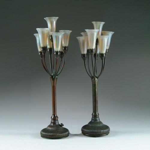 PAIR OF TIFFANY 7-LITE LILIES. Exceptional pair of lily lamps feature wonderful bronze bases with vertically ribbed foot with simple riser leading to seven flowing arms supporting lily shades. Base has wonderful patina with green highlights and is signed "Tiffany Studios New York 29721" with the Tiffany Glass and Decorating Co. logo. The magnificent shades are an iridescent clambroth with creamy opalescent vertical ribs. Interior of shades has nice light gold iridescence. Shades are signed "LCT". SIZE: Overall height is 25 in. CONDITION: Very good to excellent. 5-61240