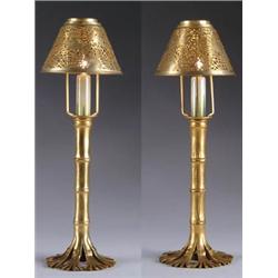 Lot 569 PAIR OF TIFFANY BAMBOO CANDLE LAMPS Very fine Tiffany candle lamps have gold patina bamboo base and glass socket covers with green pulled feather design against a white background.  Lamps are topped with gold patina pine needle cut out shades.  SIZE:  Approx. 16-1/2" t.  CONDITION:  Missing glass liner for shades, otherwise very good to excellent.  5-70748
