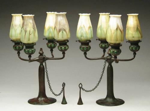 PAIR OF TIFFANY CANDLESTICK LAMPS. Beautiful pair of four-branch candlesticks, each with blown glass heads and pulled feather shades. Choice pair in new fitted boxes. Six shades are signed "L.C.T." and two are signed "L.C.T. Favrile". One with base plate signed "TIFFANY STUDIOS NEW YORK 1266". The other with no base plate is signed on the underside rim "TIFFANY STUDIOS 10087". SIZE: Overall height is 17-1/2". CONDITION: Two shades have minor roughness to fitter rims, one candlestick has very minor patina loss to foot, otherwise very good to excellent. 5-61972