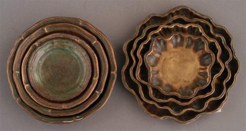 PAIR OF TIFFANY STUDIOS NESTED BRONZE TRAY SETS, each with four graduated trays, models #2017 and #1719 <BR>condition: patina wear
