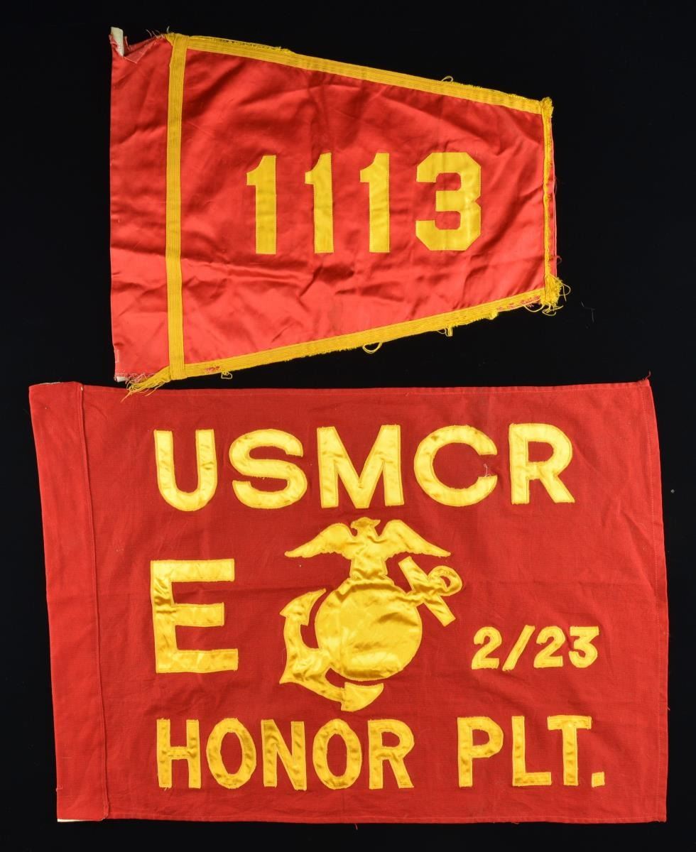 22x28" Marine Corps Reserve Honor Platoon, and corner marker for basic training.CONDITION: honor platoon flag is fine with vivid color, the corner marker is poor with frayed edges. (02-18038-25/JS)/ $200-300.