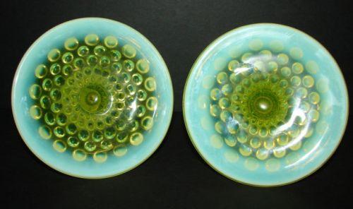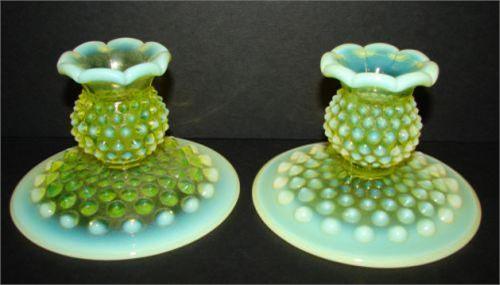 PAIR OF OPALESCENT VASELINE GLASS CANDLE HOLDERS. Hobnailed pattern. No mark. 3” H