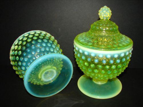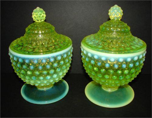 PAIR OF OPALESCENT VASELINE GLASS COVERED CANDY DISHES. Hobnailed pattern. No mark. 7” H
