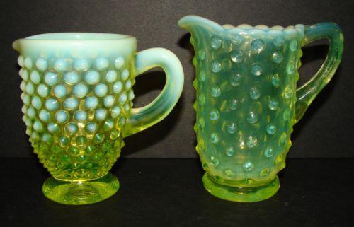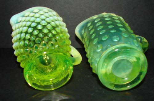 PAIR OF OPALESCENT VASELINE GLASS CREAMERS. Hobnailed pattern. Both creamers differ in size and shape. One creamer is not marked and the other is marked “E.E.” on bottom. 3.5” H & 3.75” H