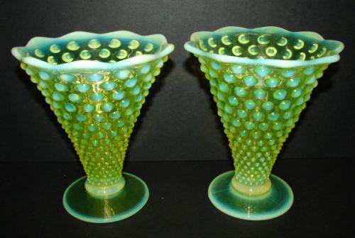 PAIR OF OPALESCENT VASELINE GLASS VASES. Hobnailed pattern. No mark. 5.5” H