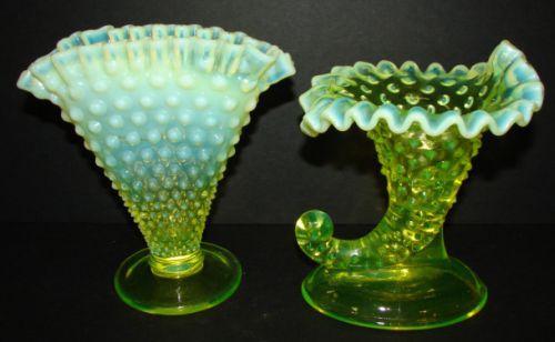 PAIR OF OPALESCENT VASELINE GLASS VASES. Hobnailed pattern. Consists of one cornucopia vase (5.75” H) with ruffled top and one fan vase (6” H) with ruffled top. No mark.