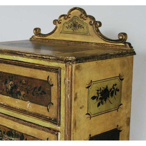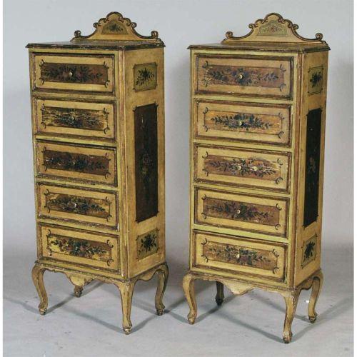 1 PAIR OF VENETIAN STYLE TALL CHESTS with painted decoration 58" high, 22 1/2" wide circa 1900 CONDITION REPORT: paint loss, replaced pulls.