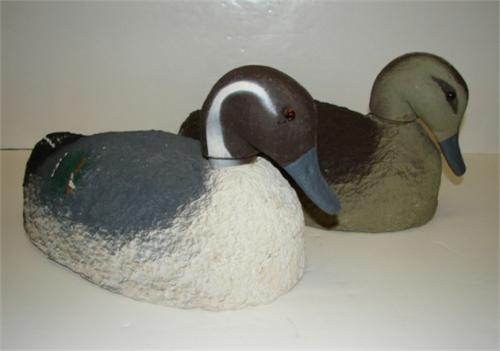 PAIR OF VICTOR PAPIER-MACHE PINTAIL DECOYS. Glass e. Removeable heads. Unsigned. 14.5” L