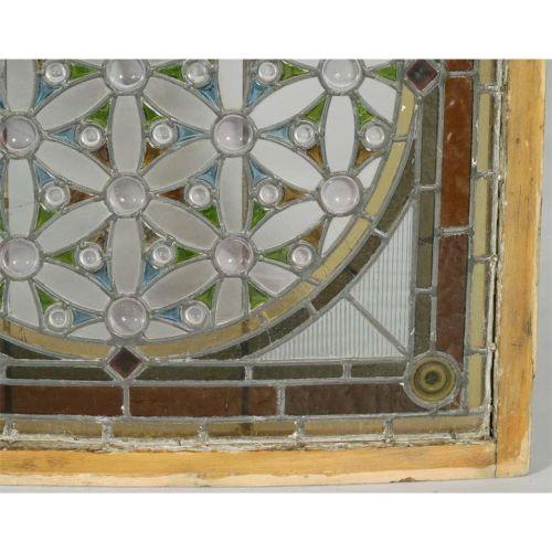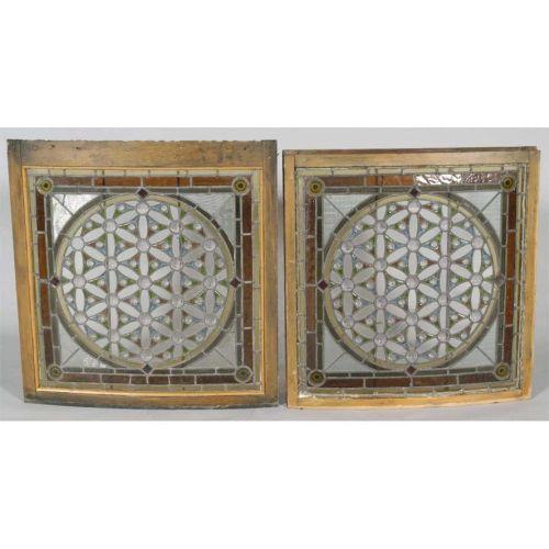 PAIR OF VICTORIAN LEADED GLASS "BULLS EYE" WINDOWS circa 1900, each about 32"x30", but not identical, CONDITION: overall about 7 cracks with one bulls-eye missing