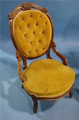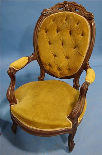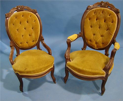 PAIR OF VICTORIAN WALNUT FINGER CARVED PARLOR CHAIRS. Consists of gentleman’s and ladies’ chairs. Gold velvet upholstery shows some fading. Top of back decorated with leaf carvings. 39” H to top of back, 26” W
