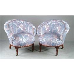 Lot # 1293 PAIR OF VICTORIAN UPHOLSTERED SLIPPER CHAIRS. Round form having carved Sheraton style legs ending in caster feet. Wonderfully reupholstered in a modern print with blue and rose colors on a silver background. SIZE: 28” h; 15” seat h x 29” w. CONDITION: Very good. 9-98798 (2,000-3,000)