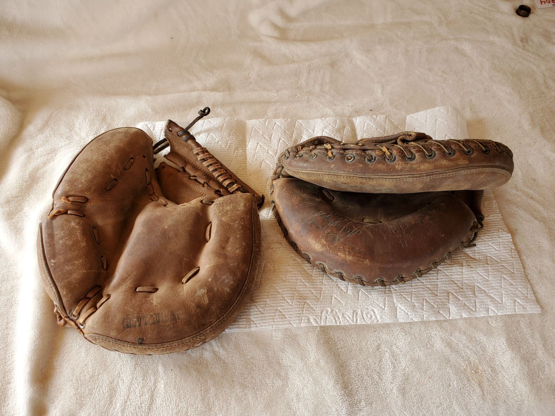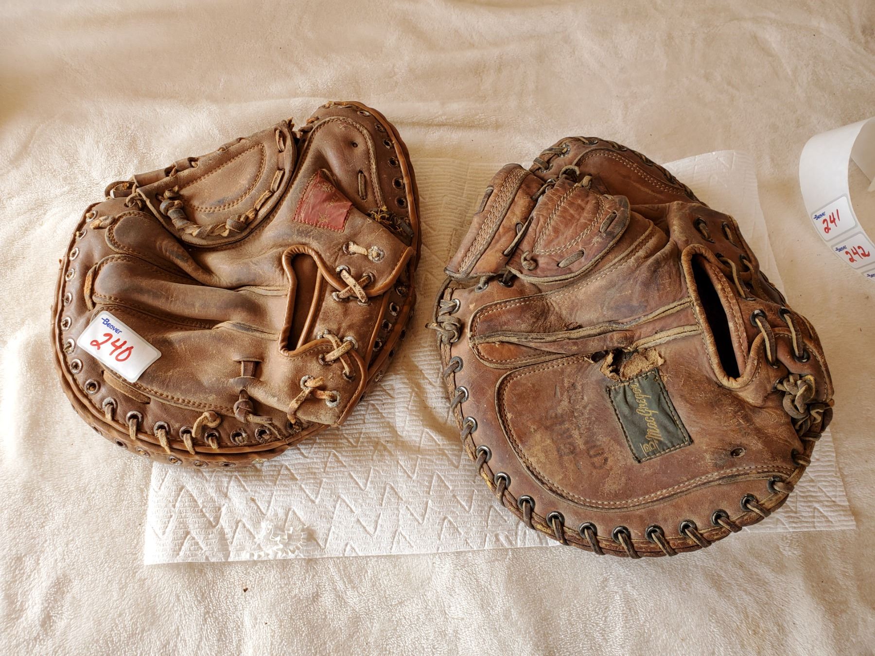 PAIR OF VINTAGE CATCHERS MITTES-FARE CONDITION- NEED SOME STITCHING REPAIRS.