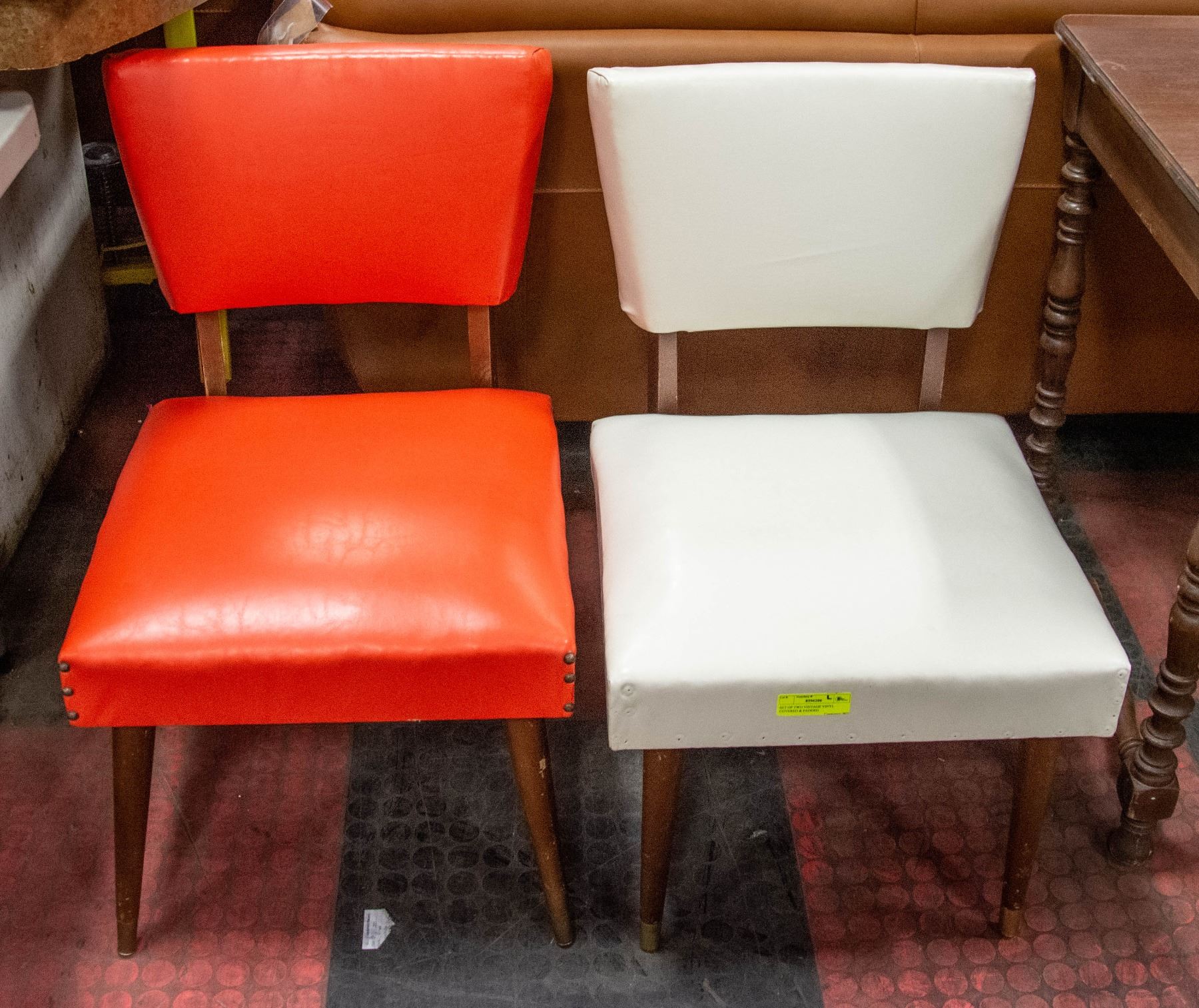 CHAIRS - ONE WHITE, ONE ORANGE, WOOD FRAME AND LEGS, PADDED SEAT & BACK (18.5"L X 22"W X 28.5"H)