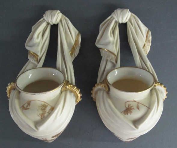 - Rd. No.48672, model 1155, ivory ground ewers hung from tasseled drapes decorated with delicate fronds enriched with gilding, height: 9 1/8".