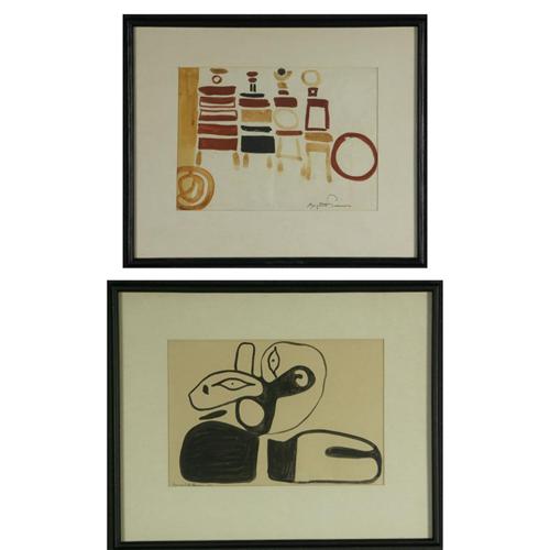 PAIR OF WATERCOLORS ON PAPER (9.25'' x 12.25'') & (9'' x 13''), Margaret Peterson (1902-1997), CA. #1: ''Deer''; Abstract Composition in B & W. Signed and dated ''53'' lower left. Signed inscription and title on the verso. #2: Abstract Composition in Color. Signed lower right. Creasing as seen. Both matted and placed in simple black wood frames. 20'' x 16'' and 18'' x 15'' Framed.